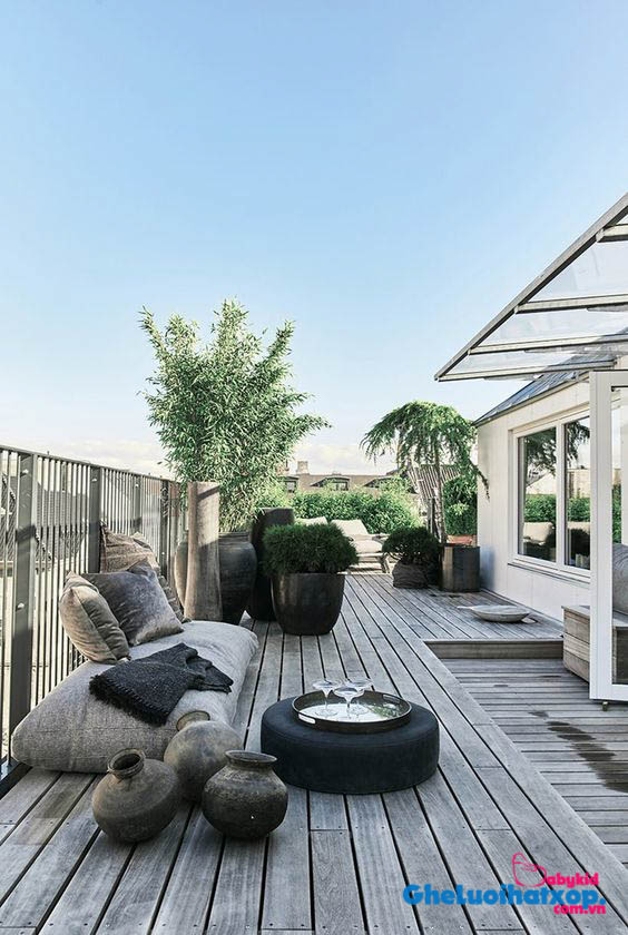 Ban công sẽ trở nên thật tiện nghi với những chiếc ghế lười nghỉ. Nếu không muốn đầu tư quá tốn kém cho góc nhỏ này, bạn có thể tận dụng các thùng nhựa, gỗ dán cộng với một chút khéo tay để làm băng ghế thư giãn bên tán cây. Đây sẽ là chỗ để bạn thư giãn và tận hưởng góc thiên nhiên tuyệt vời của riêng mình.