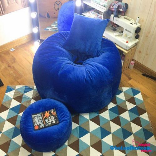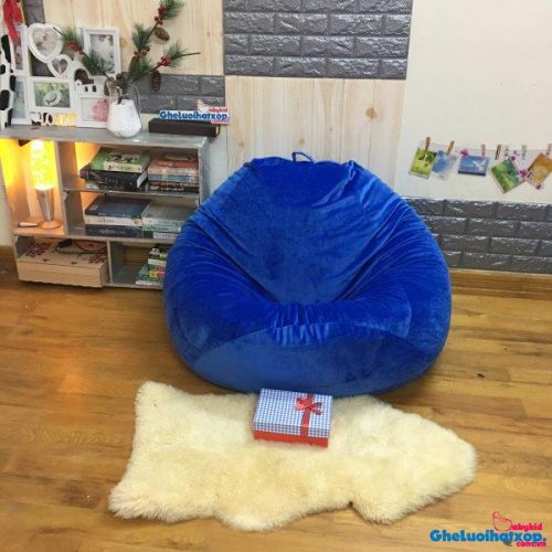 Bộ ghế lười dáng lê màu xanh coban vỏ bọc nhung GL L212 gồm: 1 gối hạt xốp dáng lê cỡ đại loại 90cm x 120cm, 1 đôn gác chân kiểu dáng trụ tròn cỡ nhỏ, 1 gối ôm (gối ôm hoặc gối tim).
