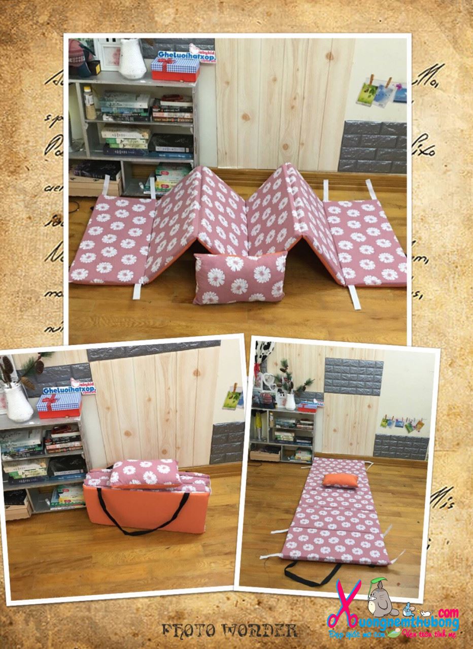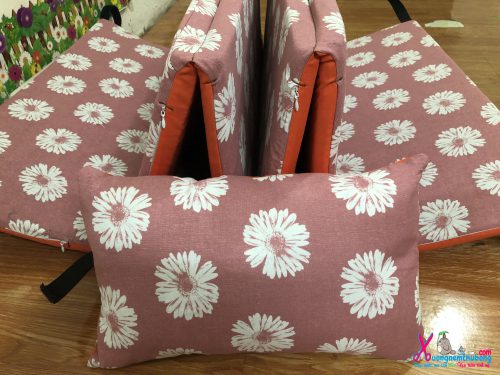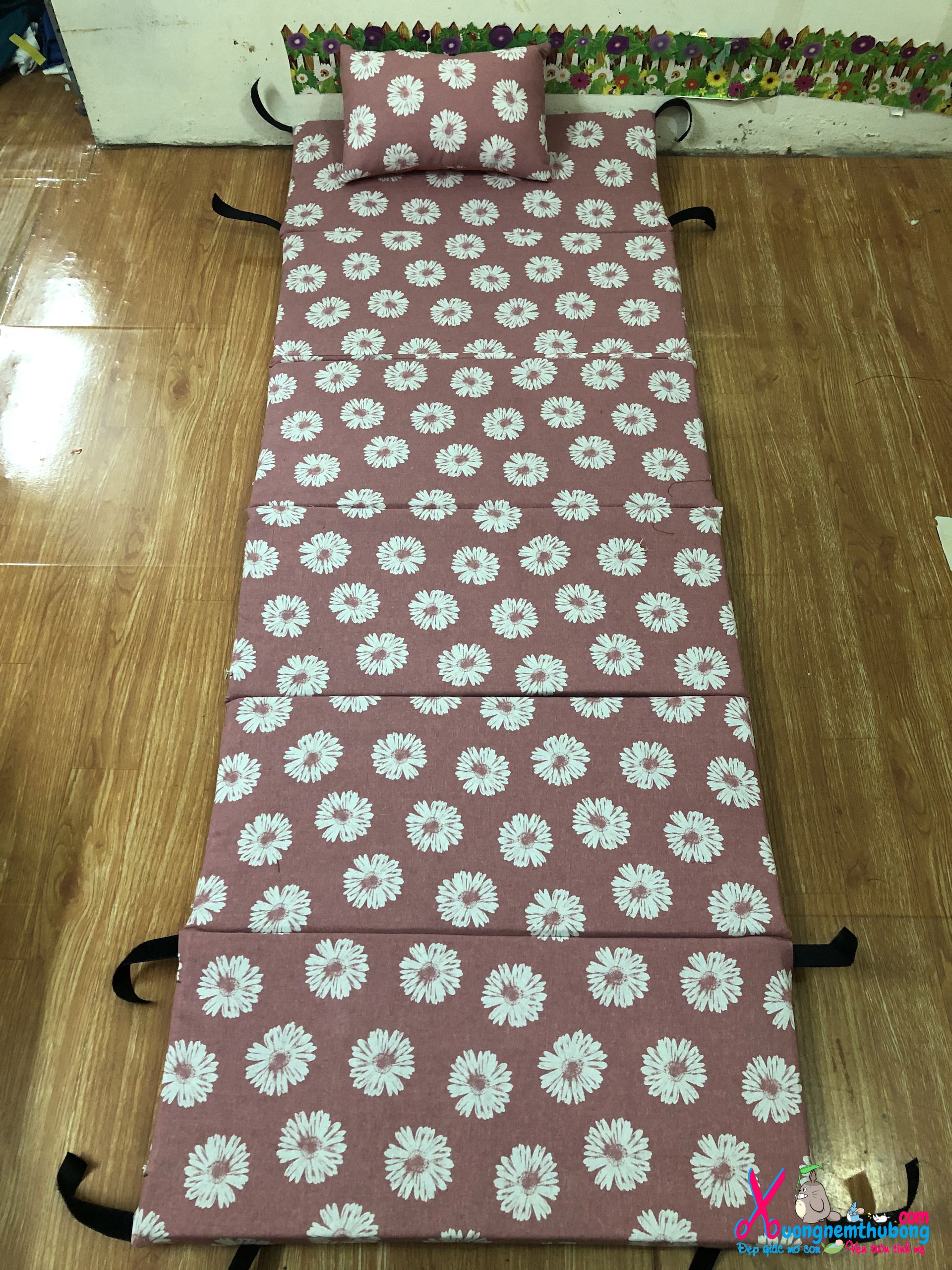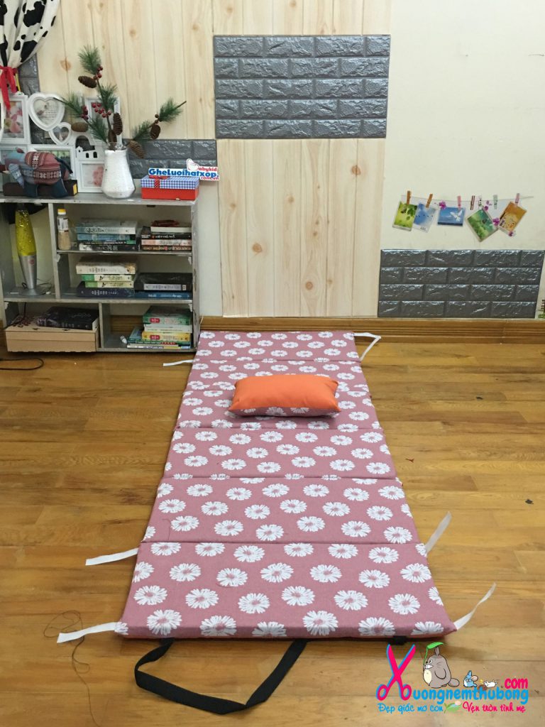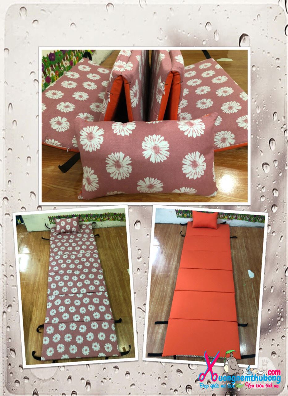 - Đệm gấp hoa cúc pha cam được sản xuất thủ công tại xưởng nội thất vải Babykid, 1 đệm gấp văn phòng thường được tặng kèm 1 gối đầu nhỏ cùng bộ.