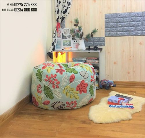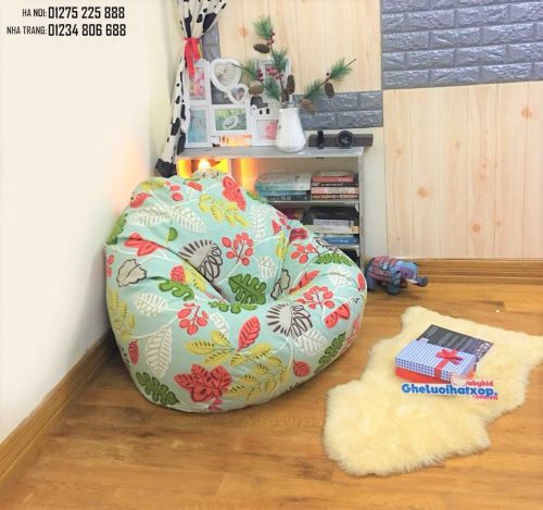 - Tên sản phẩm: Ghế hạt xốp dáng lê chất liệu canvas họa tiết lá.