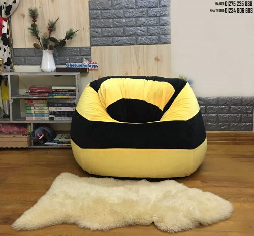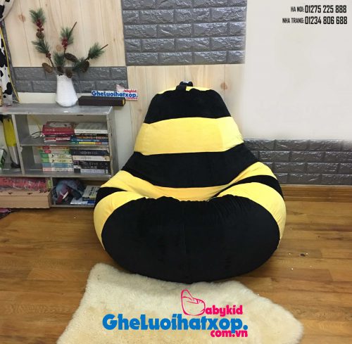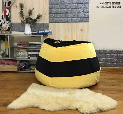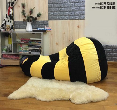 Ghế xốp hình quả lê ong vàng nhung GL L169 [L] có phần vỏ bọc được làm bằng vải nhung lạnh Hàn Quốc mềm mịn êm ái, sử dụng 2 màu vải vàng đen phối sọc rất giống chú ong vàng. Mẫu ghế lười này được xem là mẫu ghế hạt xốp cao cấp của xưởng may Babykid.
