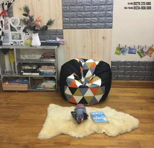 Ghế lười hạt xốp L178 có cấu tạo 2 lớp, vỏ bọc là vải canvas thoáng mát họa tiết tam giác nhiều màu, phối cùng phải kaki màu đen ở phần cạnh và đáy ghế.