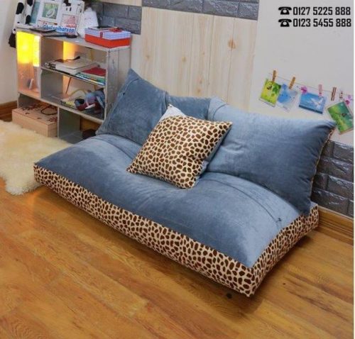 Bộ ghế lười chữ nhật SF019 có phần vỏ bọc mặt chính là vải nhung màu vàng họa tiết báo đốm, phần mặt phụ làm từ vải nhung xám trơn. Ruột xốp siêu nhẹ, êm ái.