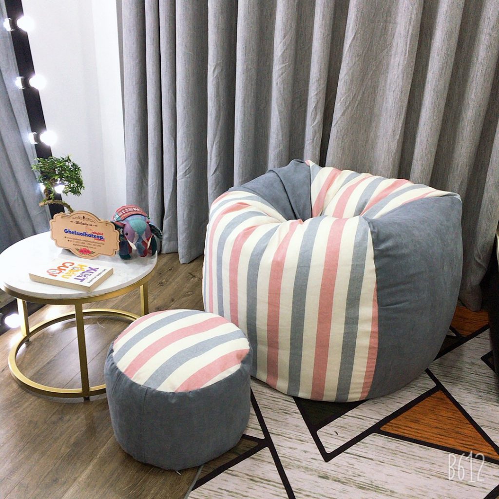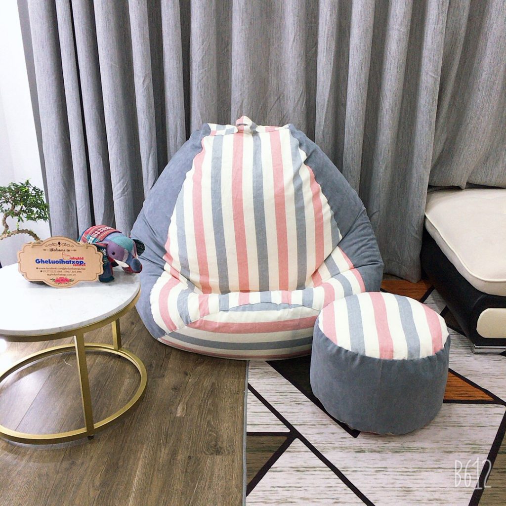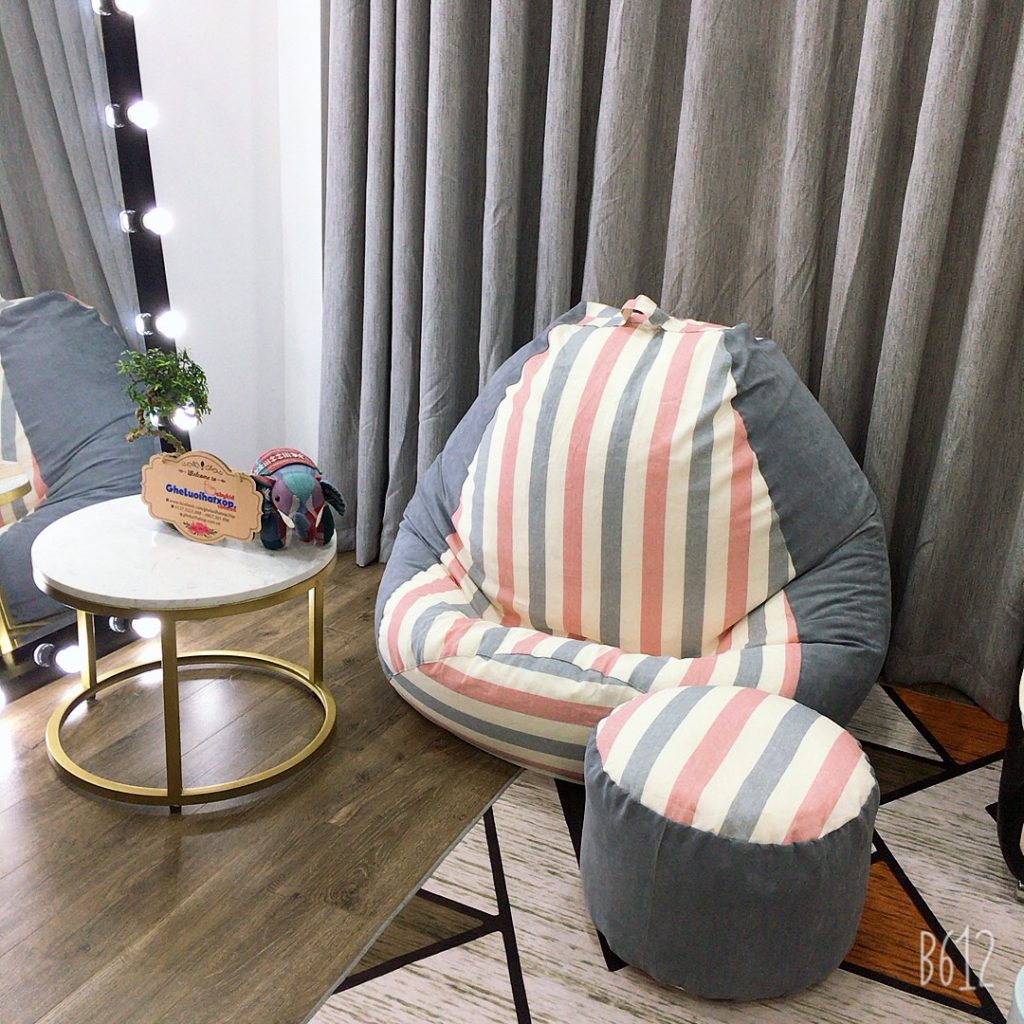 Cả combo ghế lười hạt xốp: ghế lười hạt xốp dáng lê thô nilen kẻ sọc hồng mix da lộn và đon gác chân. Quý khách hàng có thể mua lẻ ghế lười hoặc mua chọn bộ combo.