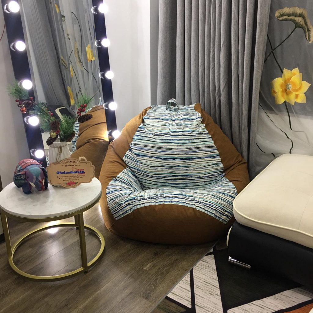 Ghế lười hạt xốp gồm vải thô là phần họa tiết chất vải hơi cứng, nhưng thoáng mát phần lưng, giá cả vừa phải, mẫu mã đẹp mắt. Kết hợp vải da lộn là phần mix 2 cạnh và phần đáy sẽ tạo cảm giác nổi phật và thêm phần sắc màu cho chiếc ghế.